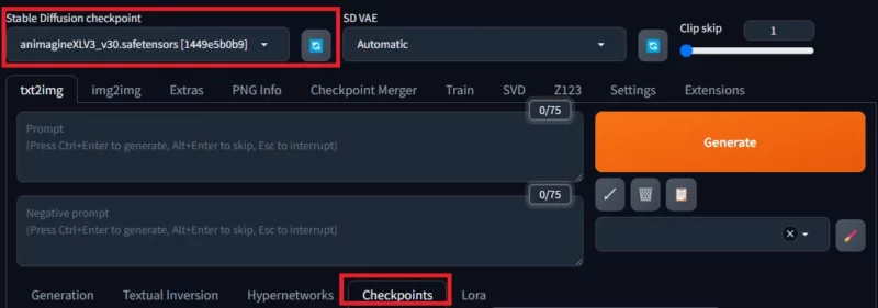 赤枠部分でanimagineXLV3…を選択できればOKです。また、画像中央下段の「Checkpoints」タブで選択しても構いません。最初はロードに数秒かかります。